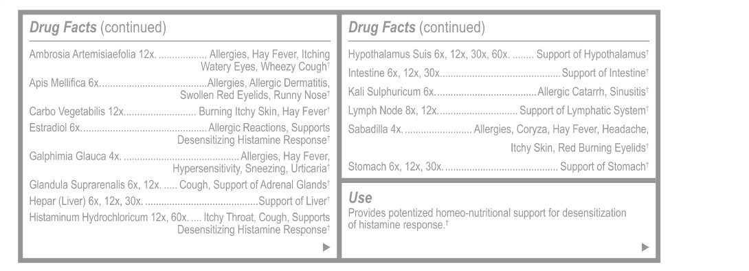 Provides potentized homeo-nutritional support for desensitization of histamine response.